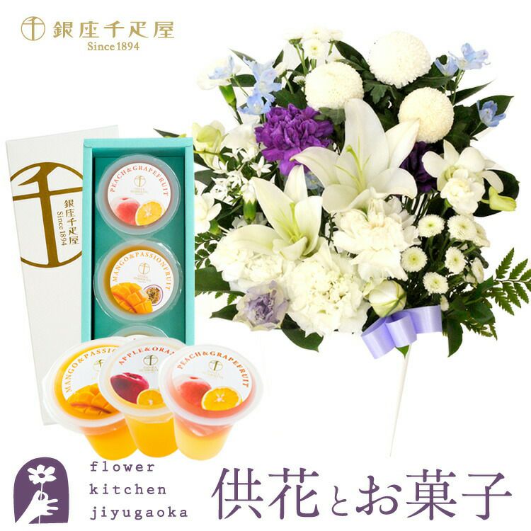 洋花を使った ユリのお供えアレンジMサイズ+銀座千疋屋 銀座フルーツジュレ3個入  生花 FKAASW