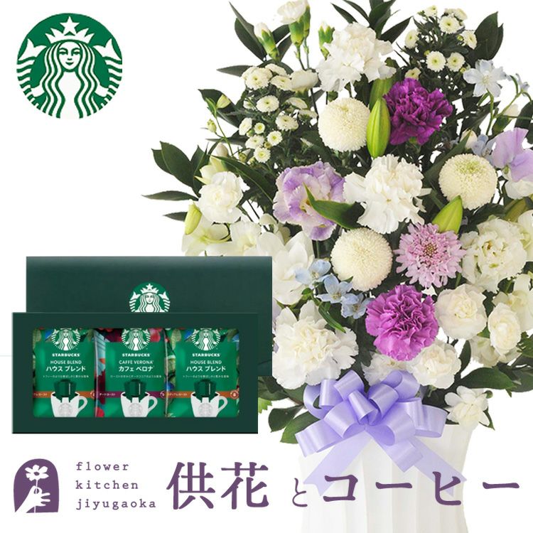 洋花を使った旬のおまかせ お供え花「かすみアレンジ」+スターバックスコーヒギフト 生花 FKAASW
