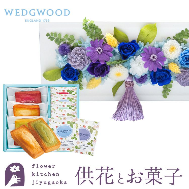 お供えフレームプリザ「白・青紫系MIX」+フィナンシェ&【ウェッジウッド】ティーバッグセット WEDGWOOD FKTPOSW