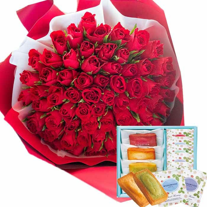 バラ60本花束「レッド」バイカラーラッピング+フィナンシェ&【ウェッジウッド】ティーバッグセット WEDGWOOD 生花 FKAASW