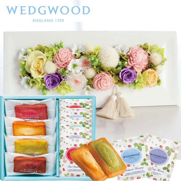 【フィナンシェ&「WEDGWOOD」ワイルドストロベリーティーバッグ】 内容量:フィナンシェ&(ストロベリー・プレーン・ピスタチオ・紫芋×各1個) ワイルドストロベリーティーバッグ(ファインストロベリー×2袋・ピクニック・ウィークエンドモーニング・アールグレイフラワーズ×1袋) 賞味期限:常温60日