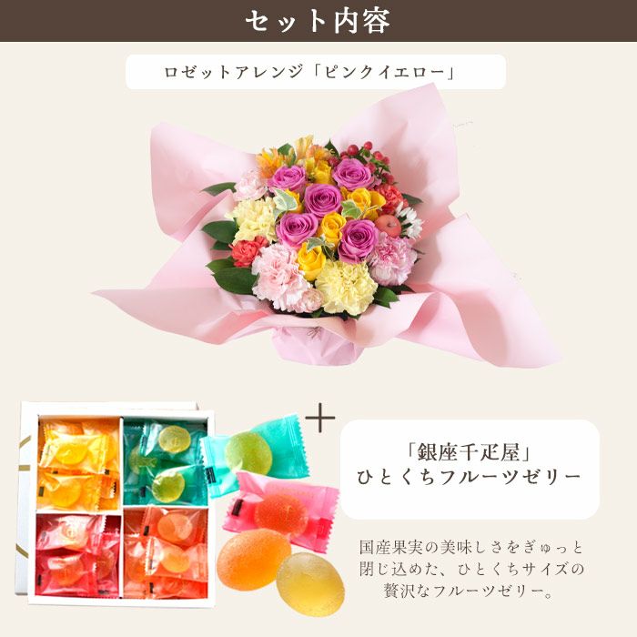 瑞々しいフルーツゼリーやなめらかなプリンは、幅広い世代に愛される人気スイーツ。色鮮やかな花と組み合わせれば、見た目にも華やかで心を癒すギフトになります。