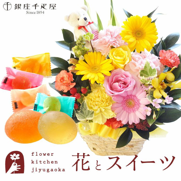 ピック付き季節のフラワーギフト【ミックス】+銀座千疋屋ひとくちフルーツゼリーセット 生花 FKAASW