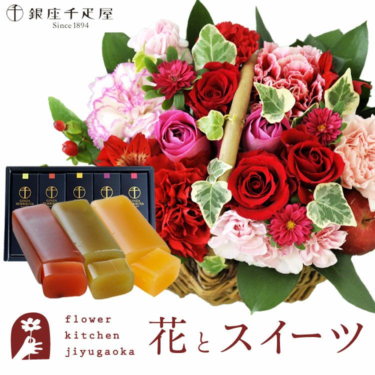 ミニョンバスケット【ピンクレッド】+【銀座千疋屋】フルーツ羊羹セット 生花 FKAASW