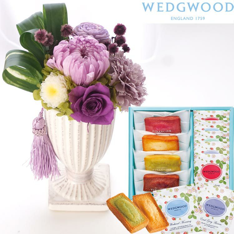 【お供え】お供えプリザーブドフラワー『花ごろも』パープルとフィナンシェ&【ウェッジウッド】ティーバッグセット WEDGWOOD FKTPOSW