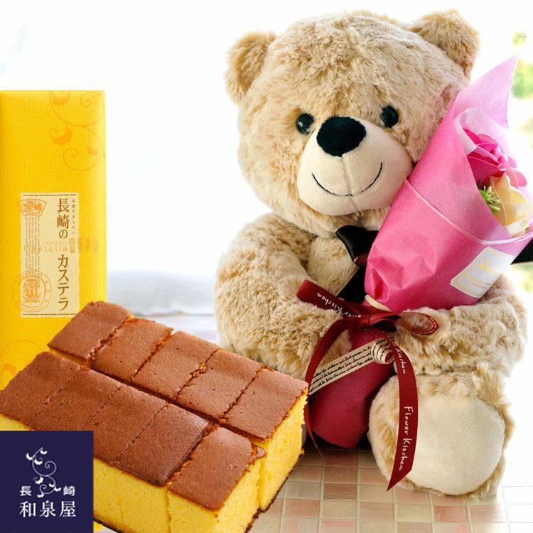 ソープフラワーアレンジ くまのマックス&フェアリーブーケ+長崎カステラ蜂蜜 0.5号 10切入 FKTPHSW