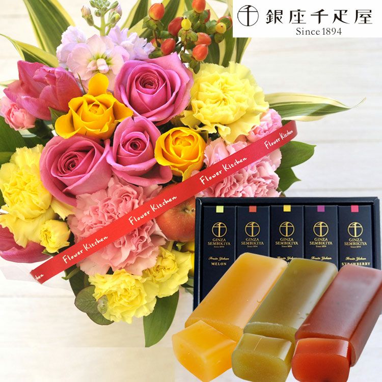 バラアレンジメント+【銀座千疋屋】フルーツ羊羹セット  生花 FKAASW