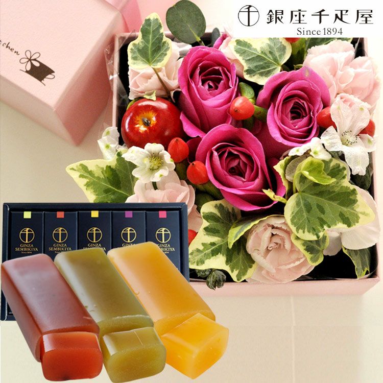 【四角フラワーボックス】MサイズBOX+【銀座千疋屋】フルーツ羊羹  生花 FKAASW