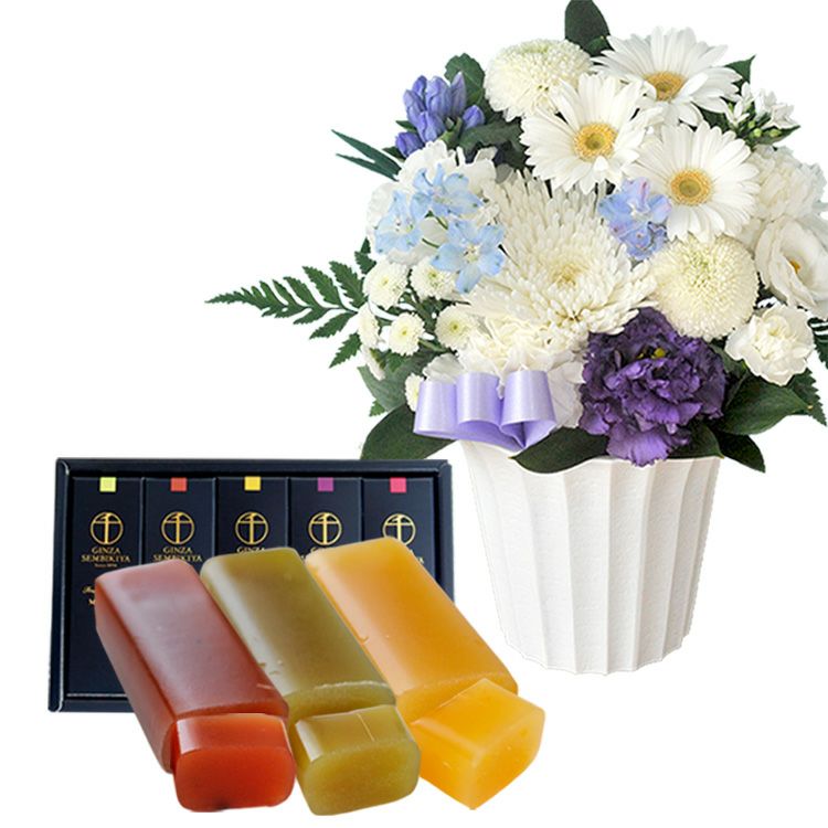 洋花を使った旬のおまかせ お供え花 Sサイズ+フルーツ羊羹セット  生花 FKAASW