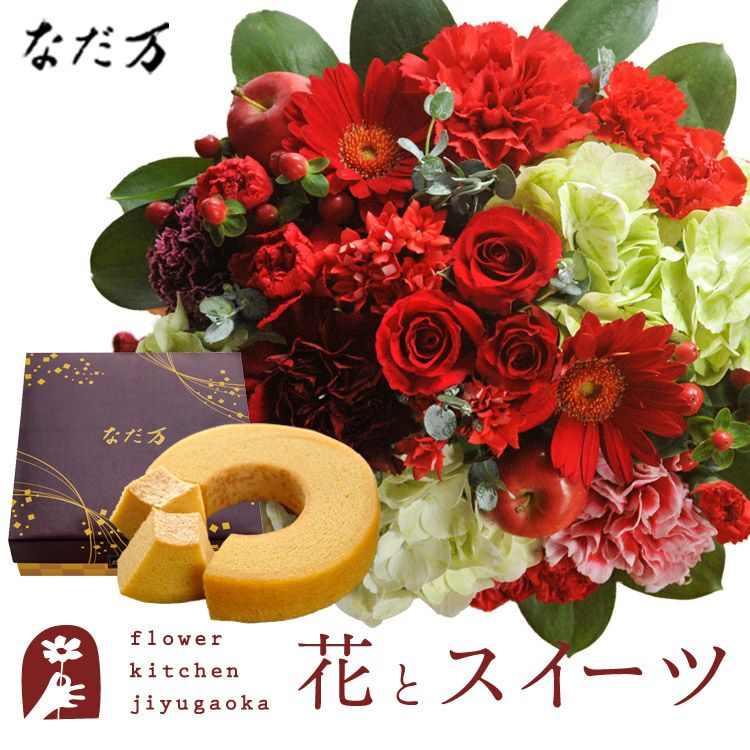 ラウンドアレンジ「レッド」+なだ万監修 和三盆バウムクーヘン 生花 FKAASW