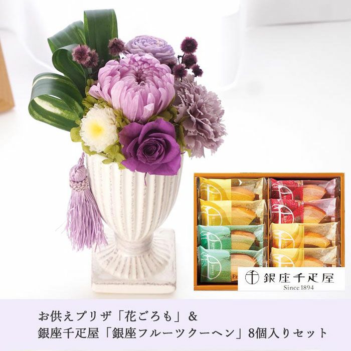 【お供え】お供えプリザーブドフラワー『花ごろも』パープルと【銀座千疋屋】銀座フルーツクーヘン ギフトセット FKTPOSW