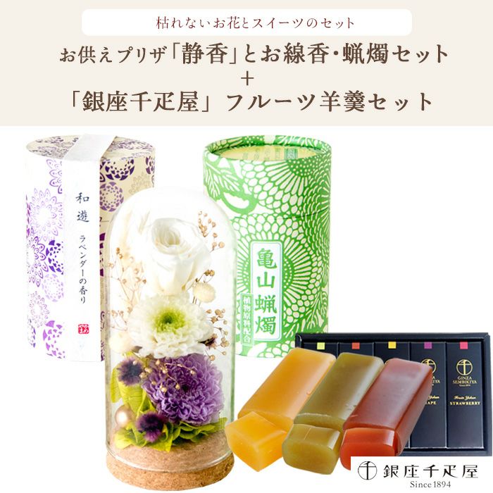 【お供え】お供えプリザーブドフラワー「静香」 と『和遊』ローソク線香セット+【銀座千疋屋】フルーツ羊羹セット FKTPOSW