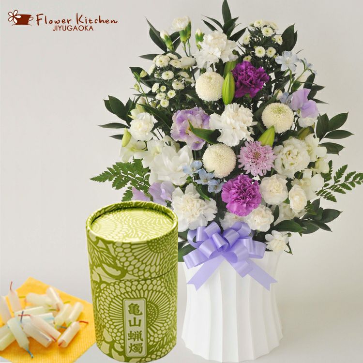 洋花を使った旬のおまかせ お供え花「かすみアレンジ」+「和遊」和遊10分蝋燭 ギフトセット 生花 FKAA