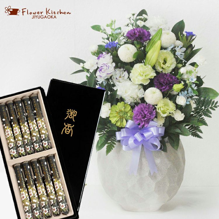 洋花を使った旬のおまかせ お供え花「鞠花アレンジ」+黒塗箱入り「特選淡墨の桜」線香セット 生花 FKAASE