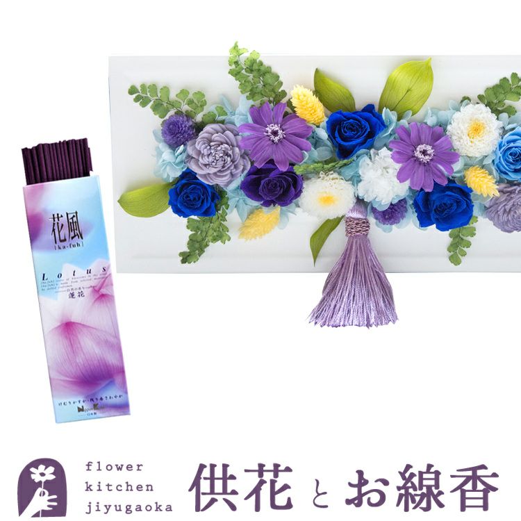 お供えフレームプリザ「白・青紫系MIX」+「花風-Lotus 蓮花」 ご進物用 ギフトセット FKTPOSE
