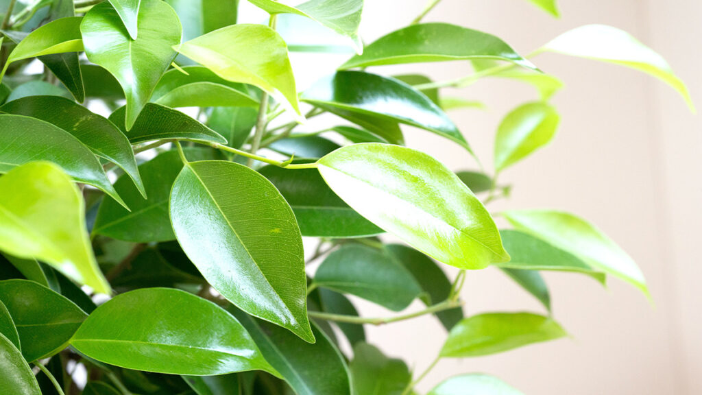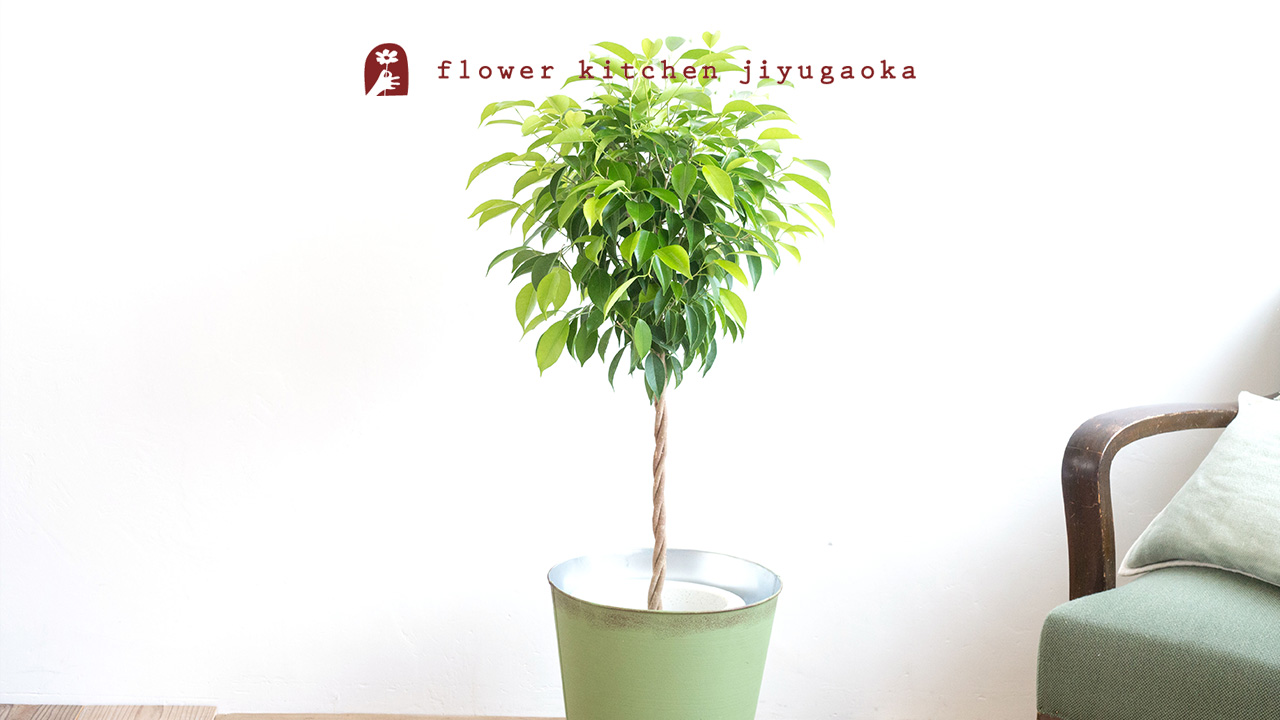 ベンジャミンは、光沢のある葉と白っぽい幹が美しい定番の観葉植物です。インテリアにもなじみやすく、初心者の方にも人気があります。