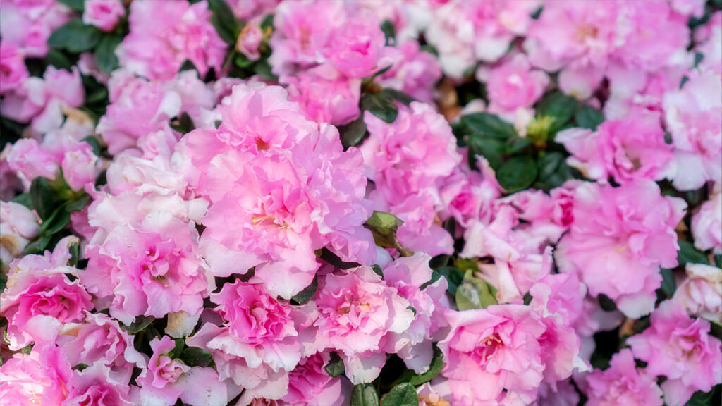 アザレアはツツジの仲間で、ヨーロッパで品種改良された華やかな花が特徴です。色は赤・白・ピンク・紫など多様で、八重咲きやフリル状の花びらを持ち、ギリシャ語の「乾燥した」が名前の由来です。
