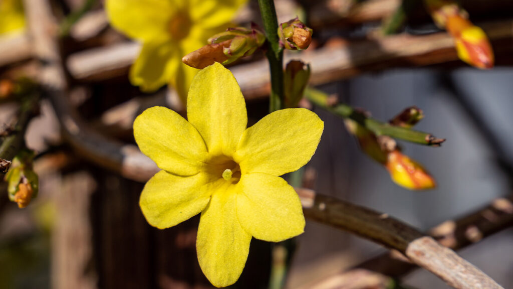 冬の終わりに枝先に咲く鮮やかな黄色の花で、梅に似た形ですがジャスミンの仲間(ウィンター・ジャスミン)であり、香りはほとんどなく素朴な美しさがあります。早春に咲き春の訪れを告げることから「迎春花」とも呼ばれ、丈夫で育てやすいことから和風庭園でも親しまれています。