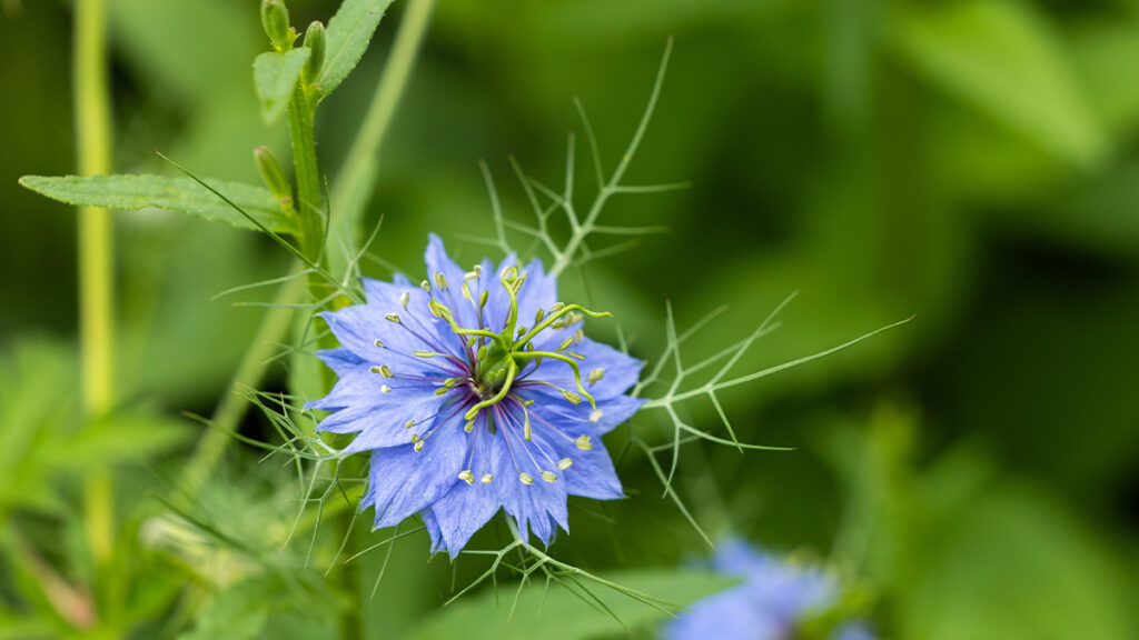 繊細な糸状の葉と青、白、ピンクなどの花が特徴で、実の中の黒い種も楽しめます。 ラテン語の「黒い(Niger)」に由来し、和名「クロタネソウ(黒種草)」も黒い種から来ています。