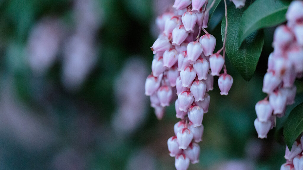 春に白やピンクの壺形の花が房状に垂れ下がり咲く姿が特徴です。葉や枝に有毒成分(アセボチン)を含み「馬が酔う」ことが名前の由来です。