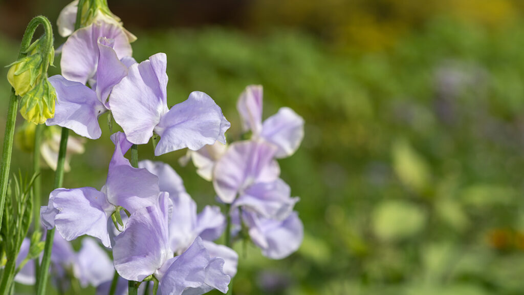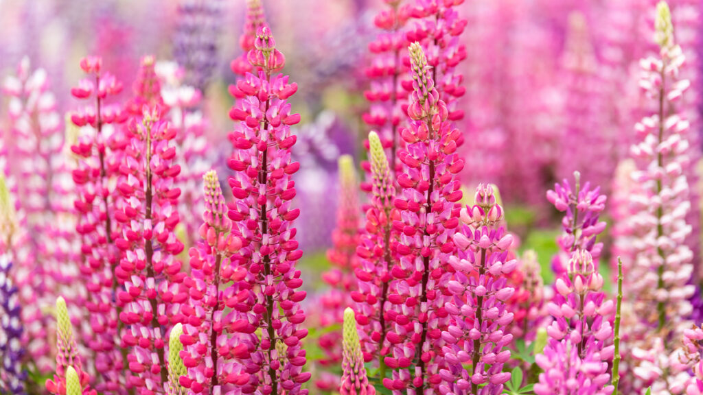 春に咲くマメ科の植物で、青や紫などの鮮やかな花が縦に伸びる穂状に咲くのが特徴です。古代ヨーロッパで食料や薬として利用され、食べると心が明るくなると信じられていたことが「想像力」などの花言葉の由来で、「貪欲」は荒れ地でも育つ生命力にちなみます。