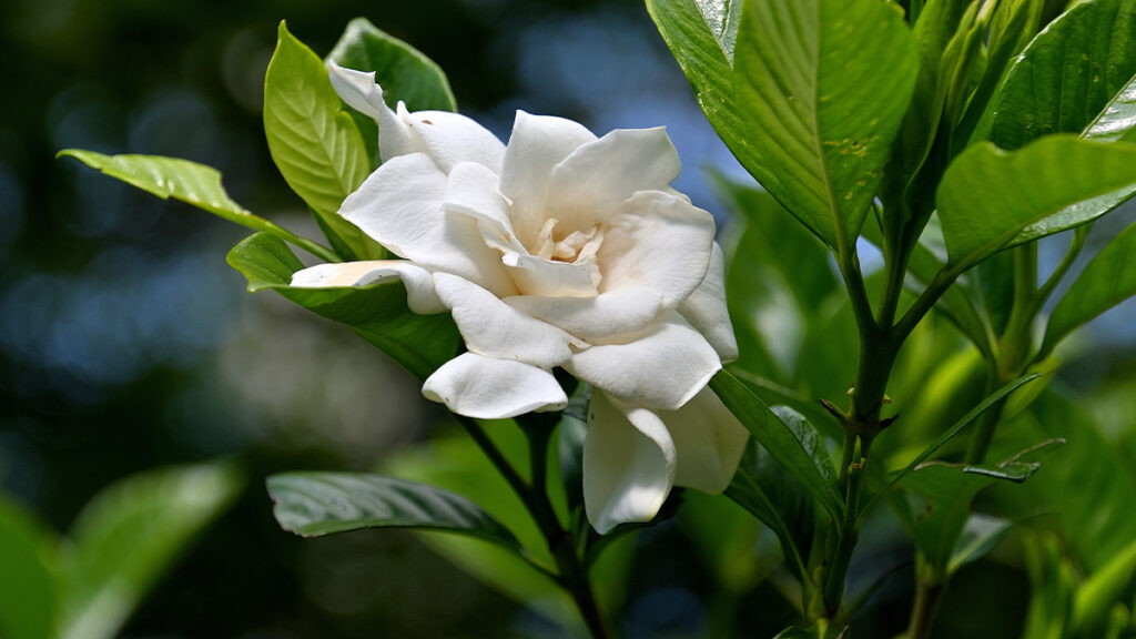 純白で甘い香りの花を咲かせる常緑低木で、名前は「口無し」が由来で、実は口を開かずに熟すため、実から色素(天然染料)が採れることでも知られ、和菓子の着色にも使われます。