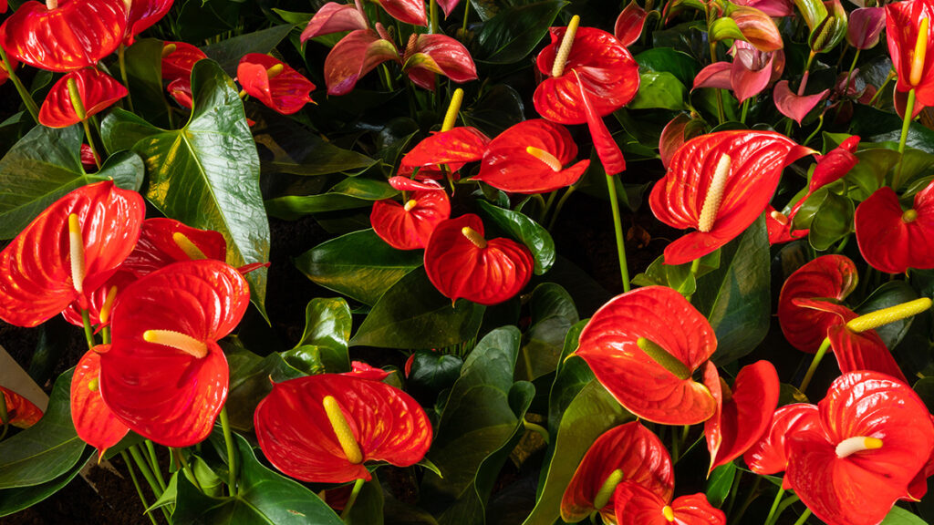 ハート型の艶やかな「仏炎苞(ぶつえんほう)」が特徴で、トロピカルで長持ちするためギフトにも人気で、ハワイでは「Heart of Hawaii」とも呼ばれます。