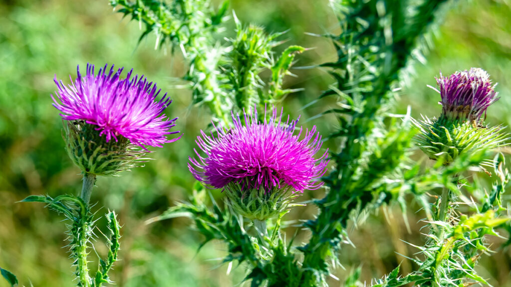 鋭いトゲに覆われた姿から「触れないで」という花言葉も持っています。力強くも繊細な印象の花で、スコットランドの国花にもなっており、トゲが敵の侵入を防いだという逸話が「独立」の由来です。