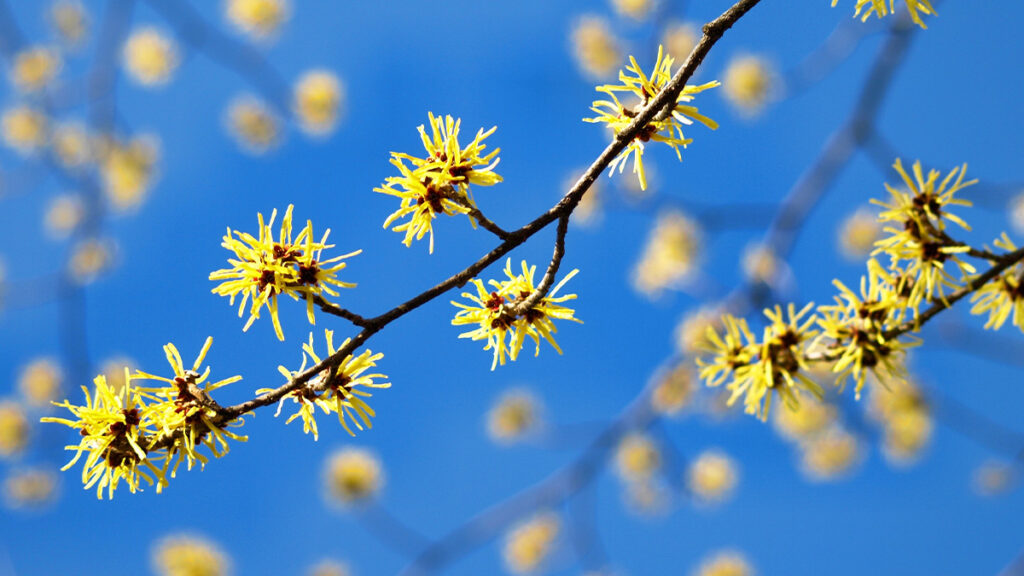冬の終わりに葉より先に細い紐状の黄色い花を咲かせ、春を告げる植物です。名前の由来は「まず咲く」や「万作(豊作)」からきており、その不思議な姿と開花時期から、古くから占いに使われたり、神秘的な力があると信じられてきました。