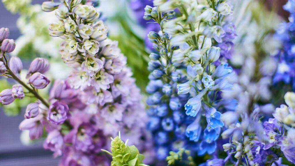 青や紫の鮮やかな花が空へ向かって伸びる姿が特徴です。色によって「澄んだ瞳(青)」、「可憐な瞳(白)」、「移り気(ピンク)」など意味が分かれ、切り花やブーケで人気ですが、全草に毒性があるため注意が必要です。