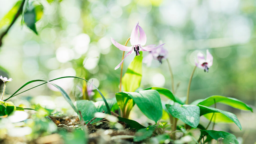 うつむいて咲く姿が初恋の少女や嫉妬する様子を連想させます。特徴は、早春に咲くピンク~赤紫色の下向きの花で、太陽に反応して開閉し、夏には地上部が枯れる儚さがあり、球根は地下深くに潜る性質を持ちます