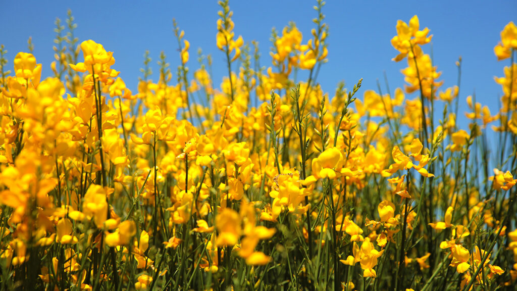マメ科の植物で、春に枝いっぱいに咲くチョウのような花が特徴です。ヨーロッパ原産で、箒の材料にされたことから「清潔」という花言葉がつき、たくさんの花が咲く様子から「豊穣」の意味も持ちます。