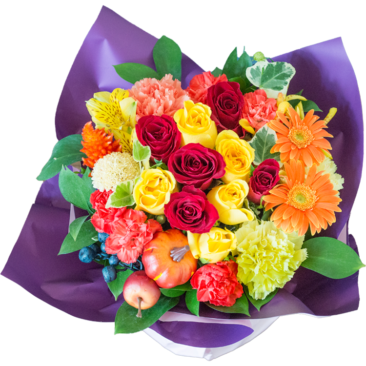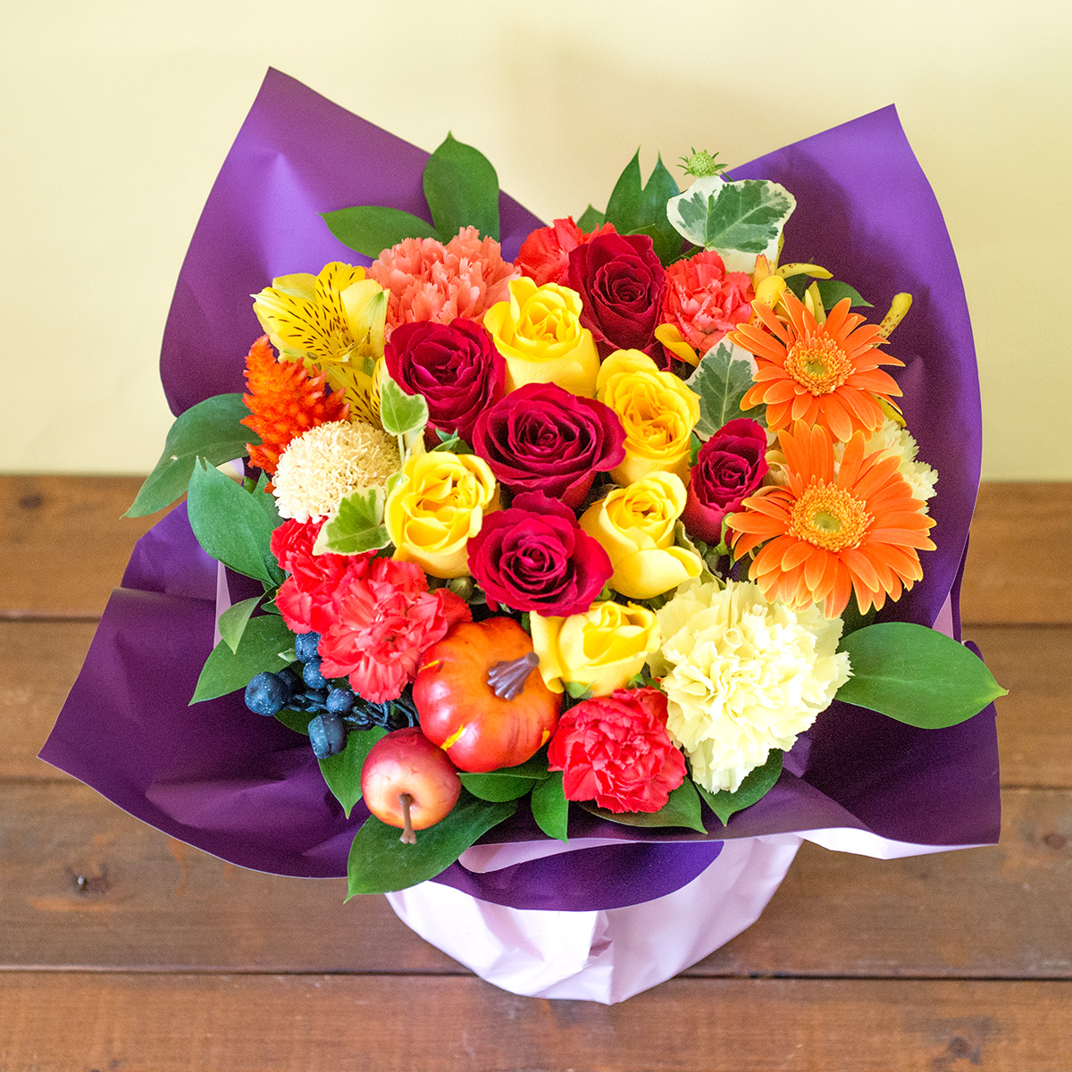 10本バラハロウィンアレンジ 2025.10.16 2025年10月16日 深まる秋にぴったりな、赤・黄・オレンジのバラやガーベラを使った華やかなアレンジ。かぼちゃやリンゴの実物を添えて、季節感たっぷりのハロウィンカラーに仕上げました。ハロウィンアレンジのお届けは【10月31日まで】です。 10本バラハロウィンアレンジ5,500円