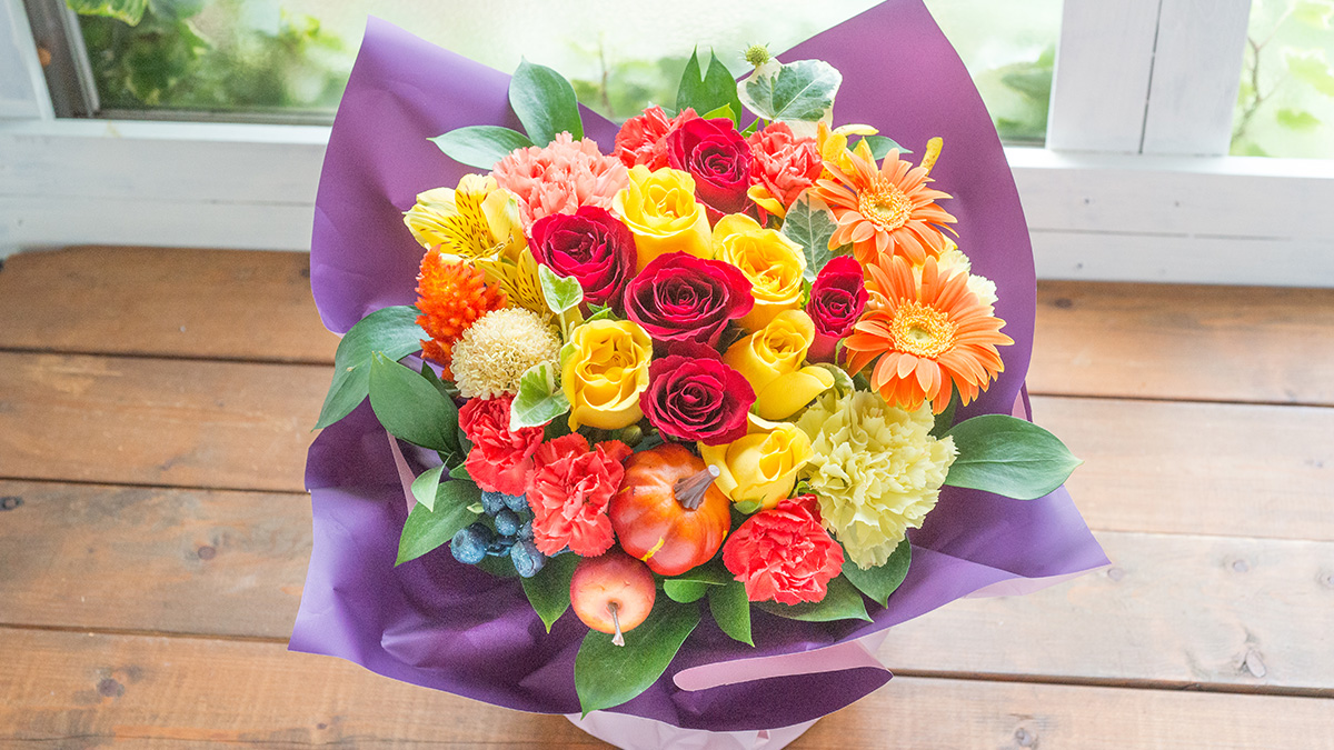 フローリストがハロウィンイメージのお花を用意するとなると、このオレンジ、紫、赤、イエローなど、秋らしさに加えてちょっぴりダークな世界観をめざします。