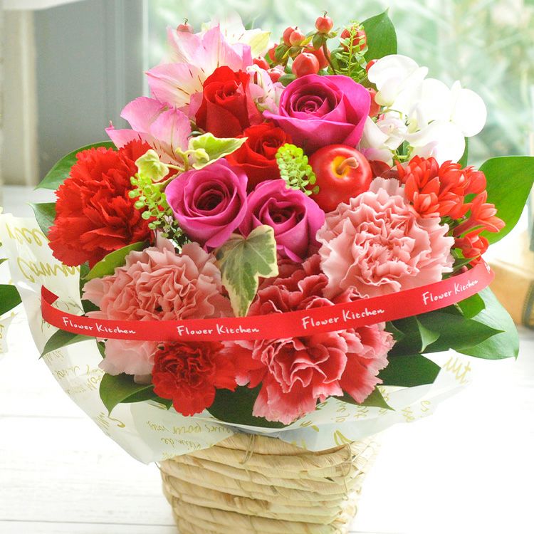 花瓶がなくてもそのまま飾れるスタンドタイプなので、見た目の華やかさと扱いやすさを兼ね備えているのも魅力。特別感のある花束を贈りたいシーンにおすすめです。