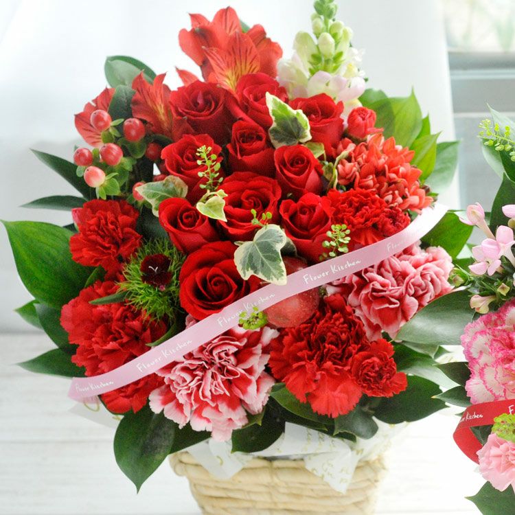 アレンジメントは、器やカゴにお花を活けた、そのまま飾れるスタイル。