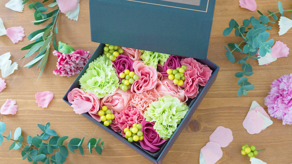 箱を開けた瞬間にお花が広がる、サプライズ感のあるボックスフラワー。