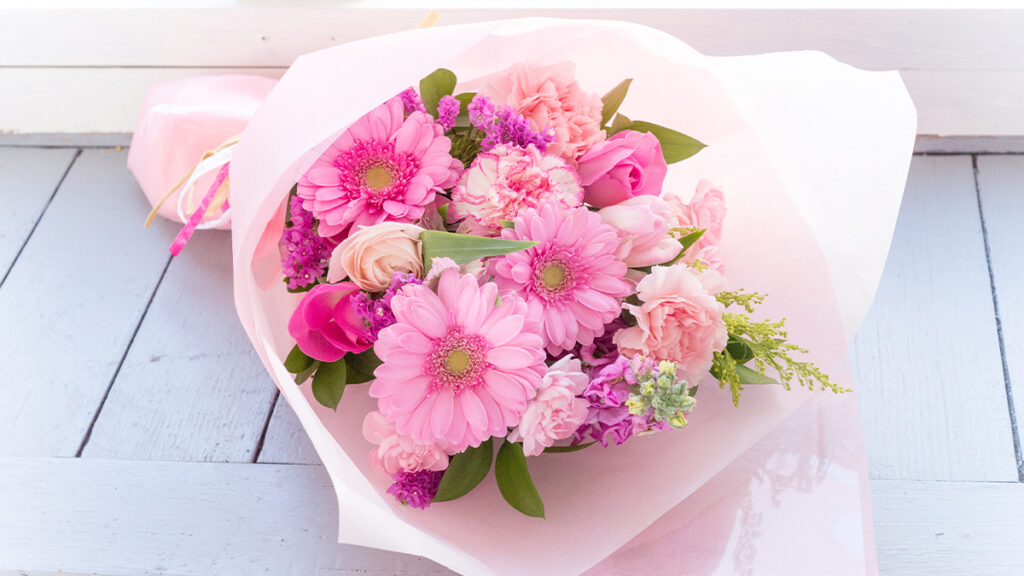 ラッピングされた花束は、そのまま手渡しできる特別感があり、家族や親戚からのお祝いとしても人気。