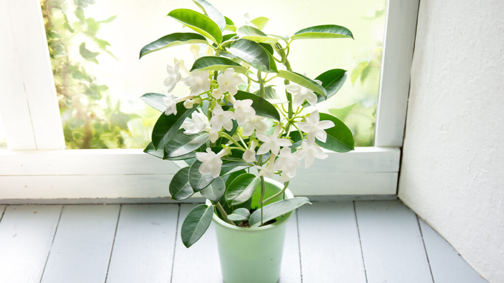 純白の星形の花と甘い香りが上品なマダガスカルジャスミン。温度管理さえ押さえれば、鉢植えでも毎年美しい花を室内で楽しめる人気の観葉植物です。