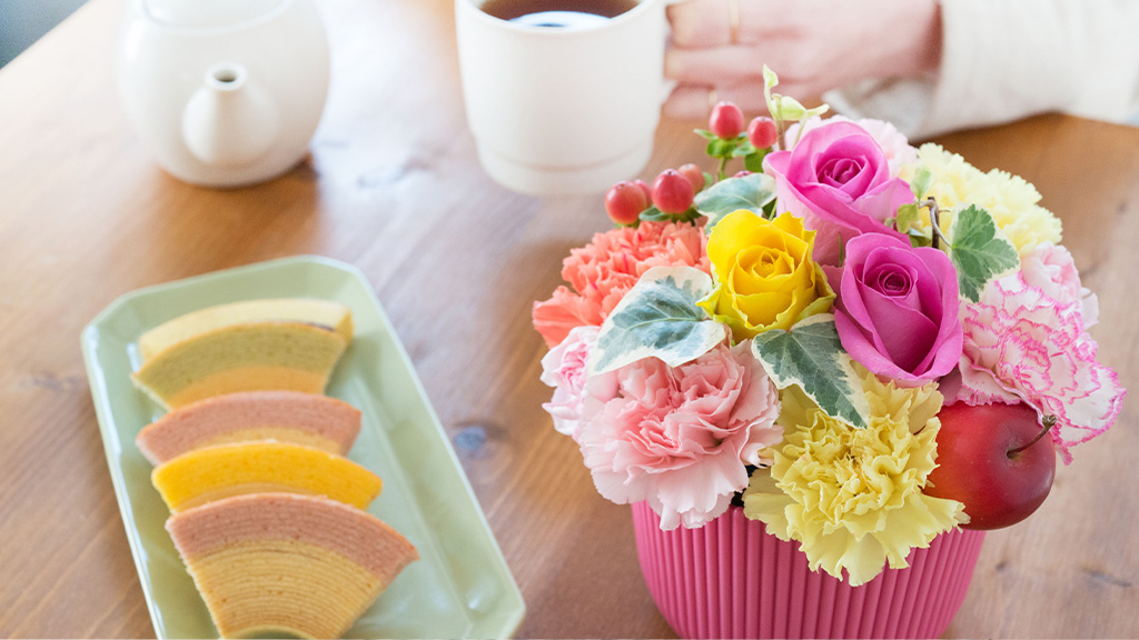 お花とスイーツをセットで贈ることの魅力は、楽しみ方が何倍にも広がること。お花の華やかさを目で見ること、青々とした香りを感じることに加えて、スイーツを味わう楽しみがあると、人の五感がはたらいて、なんともいえない多幸感を味わうことができます。