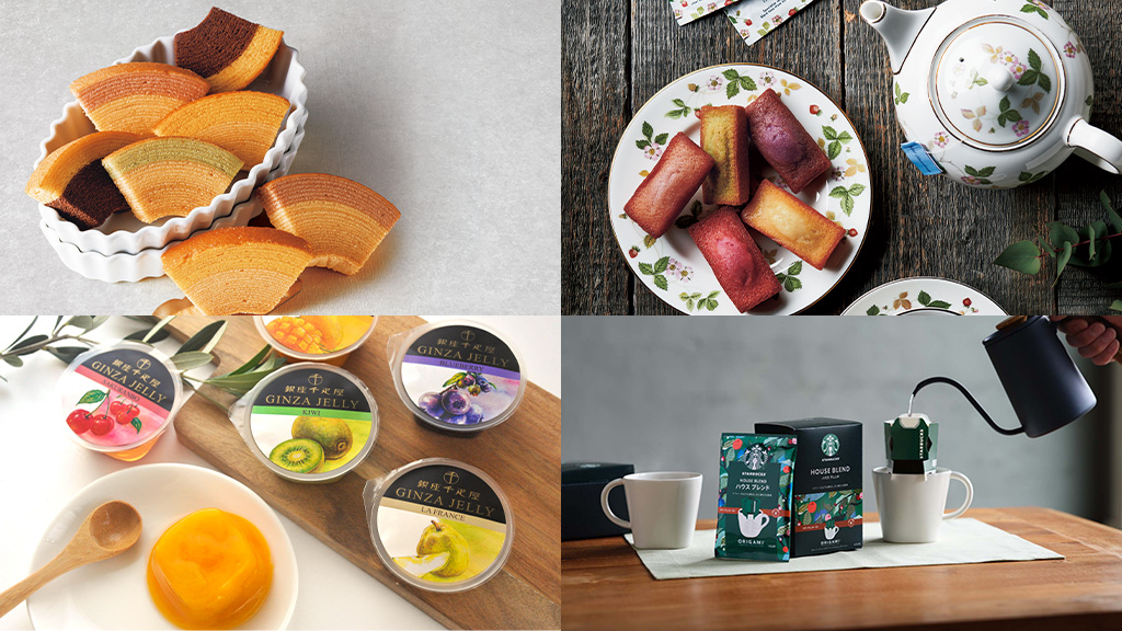 フラワーキッチンでご用意しているスイーツギフトは、ほとんどが安心感のある人気ブランド。フルーツの華やかさがかわいい銀座千疋屋、老舗の上品な落ち着きが光るなだ万、おしゃれなあの人に届けたいスターバックス。種類も豊富で、これらのブランド以外でも、カステラ、バウムクーヘン、ミルフィーユなど、考えただけでワクワクしてしまうようなものをそろえています。ウェッジウッドの花柄の紅茶が本物のお花といっしょに届いたら、箱を開けた瞬間から幸せが広がりますよね。