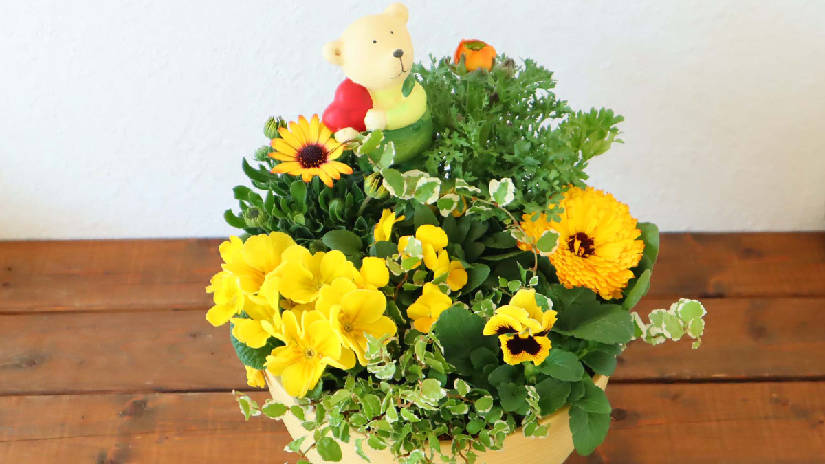 お花の組み合わせも考えられていて、相性やバランスのいいお花を集めているので、ひと鉢だけでも存在感があり、鉢の周りがぱっと明るくなってくれます。いつの間にか、「あのすてきなお花のあるお家」とご近所さんの評判になってしまうかもしれません!