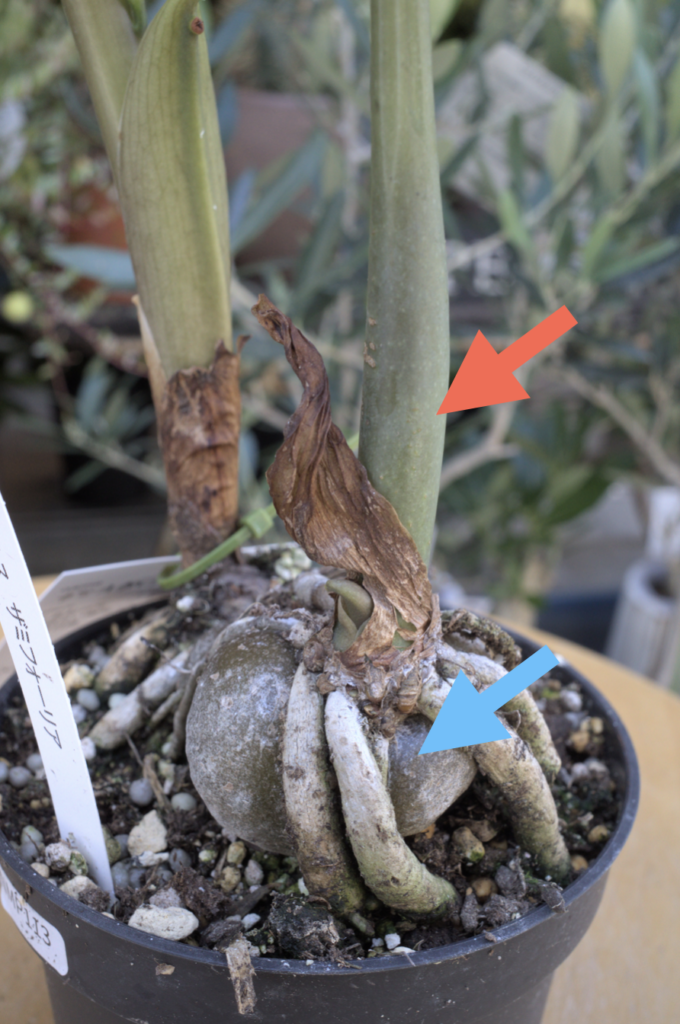 大きさは品種にもよりますが、60cm程度まで成長します。樹木のように枝はありませんので、1つの葉の大きさがそのまま高さになります。成長するに従って、球根のような塊根が増えます。塊根が増えてくるとだんたんと横にも広がっていきますが、これは非常にゆっくりとしたペースです。
