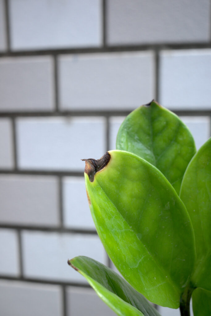ザミオクルカスはあまり直射日光の当たらない半日陰に自生していることもあり、直射日光に当てると葉焼けを起こして、葉先が黒くなってしまったり、悪化すると葉全体にダメージを受けてしまいます。