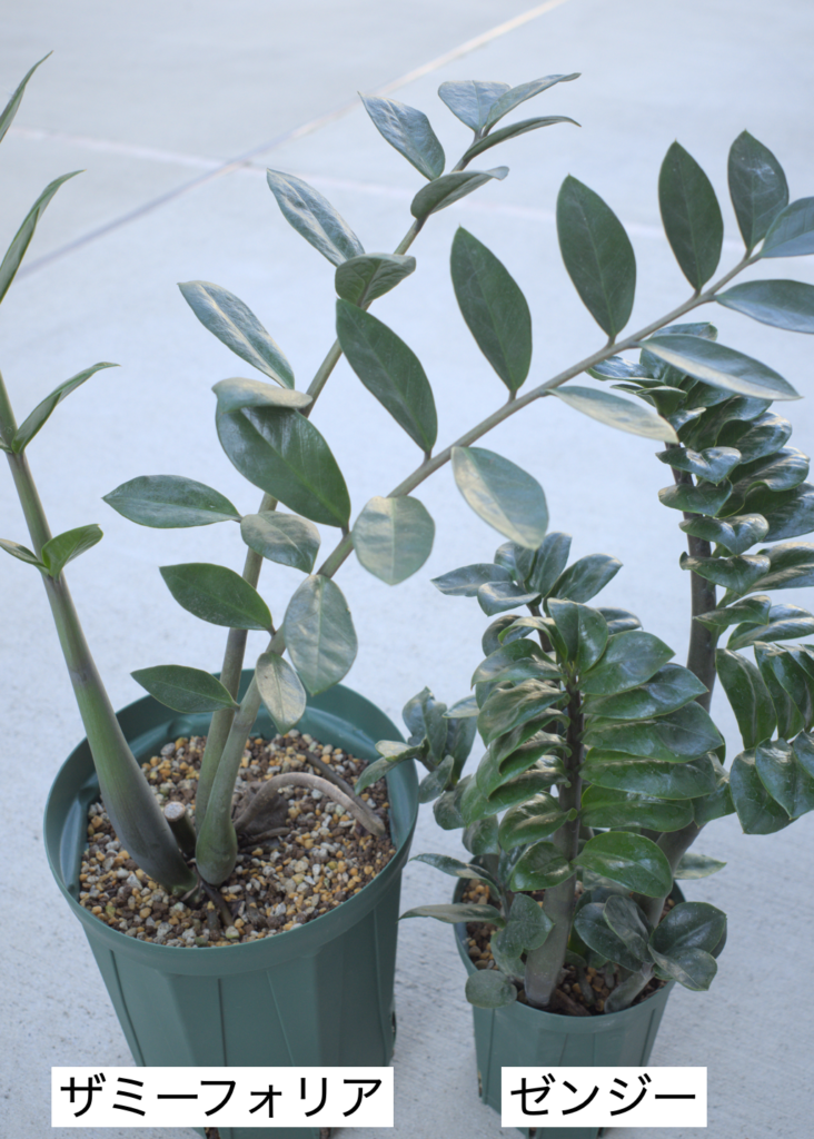野生のザミオクルカス・ザミーフォリアの茎(正確には葉柄)は長細いですが、日本で一般的に流通しているものは野生のものよりも葉柄の付け根部分が太めです。そのため、品種として名前が付けられたものではありませんが、栽培家の手によって増やされる過程である程度変化していると思われます。