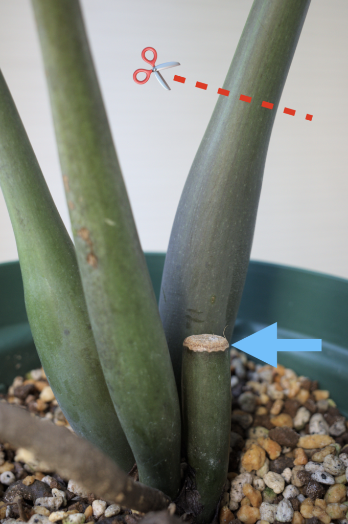 ザミオクルカスの葉柄には、古くなった葉を切り離すことを目的としたような仕切りがあります。この仕切りの少し上で切ることで、雑菌の侵入を抑えることができます。この仕切りは葉が古くなってくると自然と見えてくることが多いです。