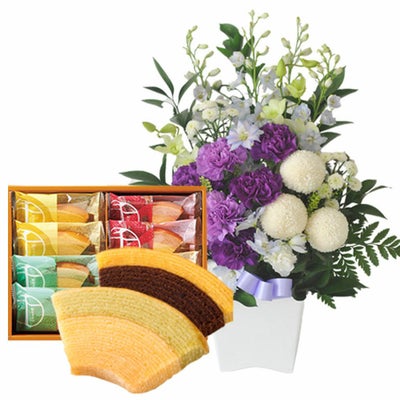 花とスイーツのセット ムーンダストを使ったお供えアレンジメントMサイズ+【銀座千疋屋】千疋屋フルーツクーヘンセット 生花 FKAASWのレビュー