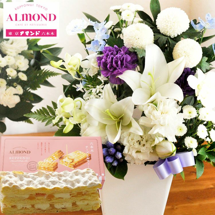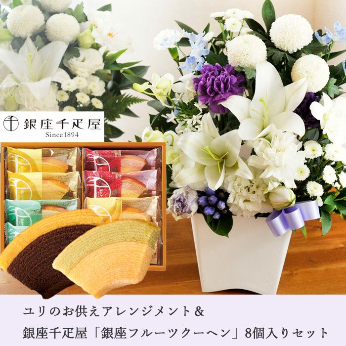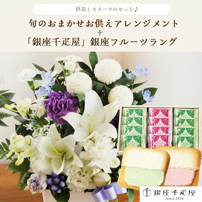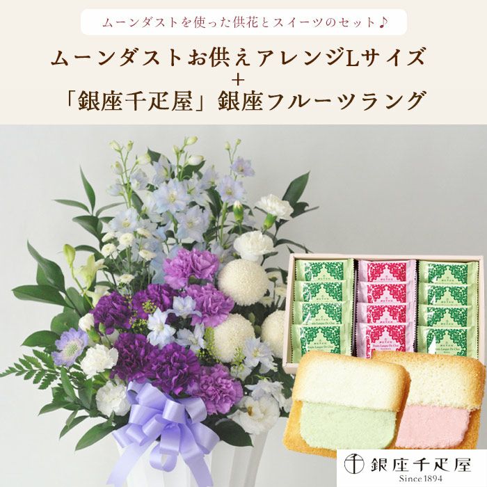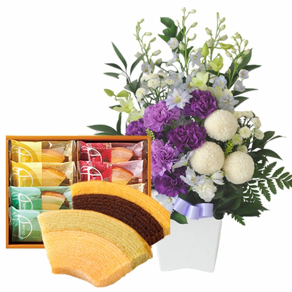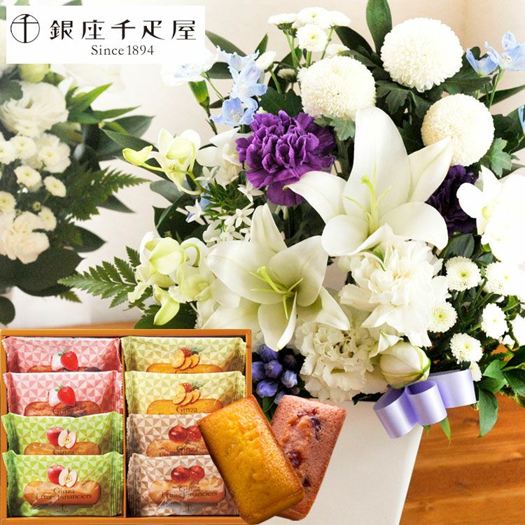 花とスイーツのセット ムーンダストを使ったお供えアレンジメントMサイズ+【銀座千疋屋】千疋屋フルーツクーヘンセット 生花 FKAASW