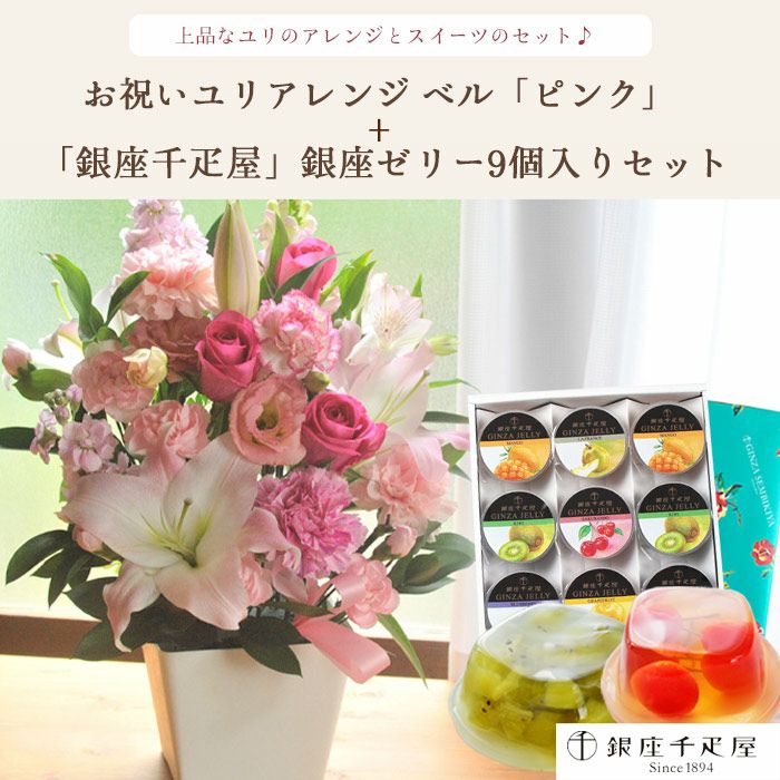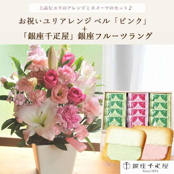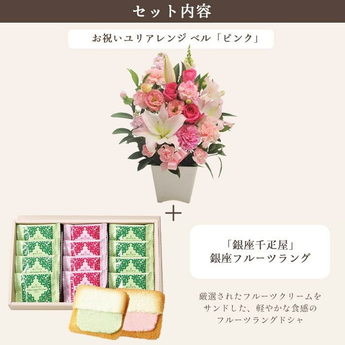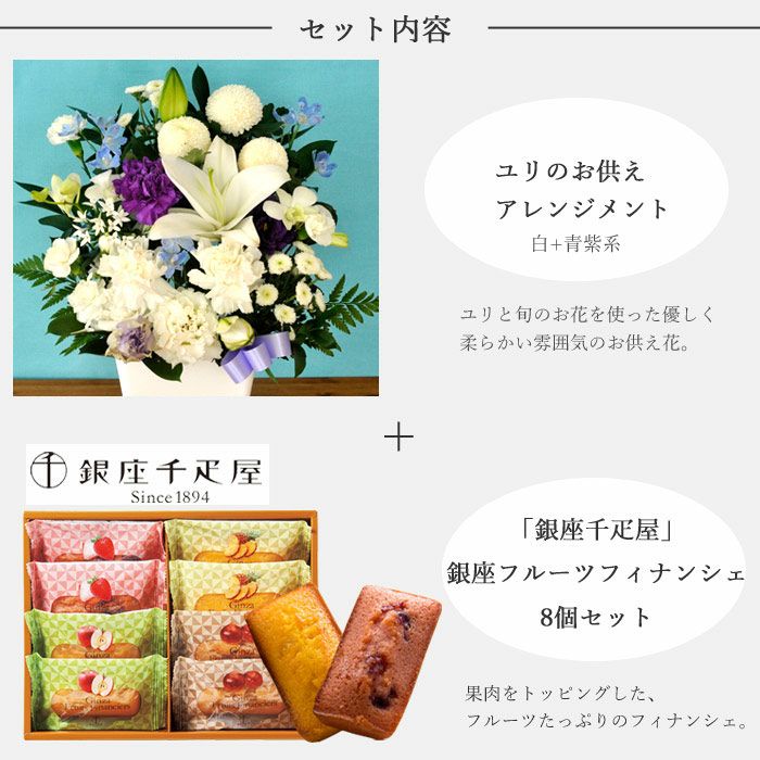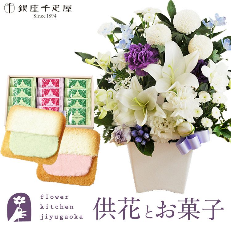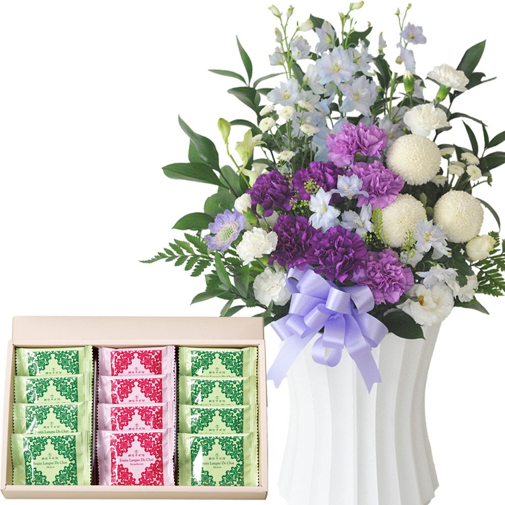 花とスイーツのセット ムーンダストを使ったお供えアレンジメントMサイズ+【銀座千疋屋】千疋屋フルーツクーヘンセット 生花 FKAASW