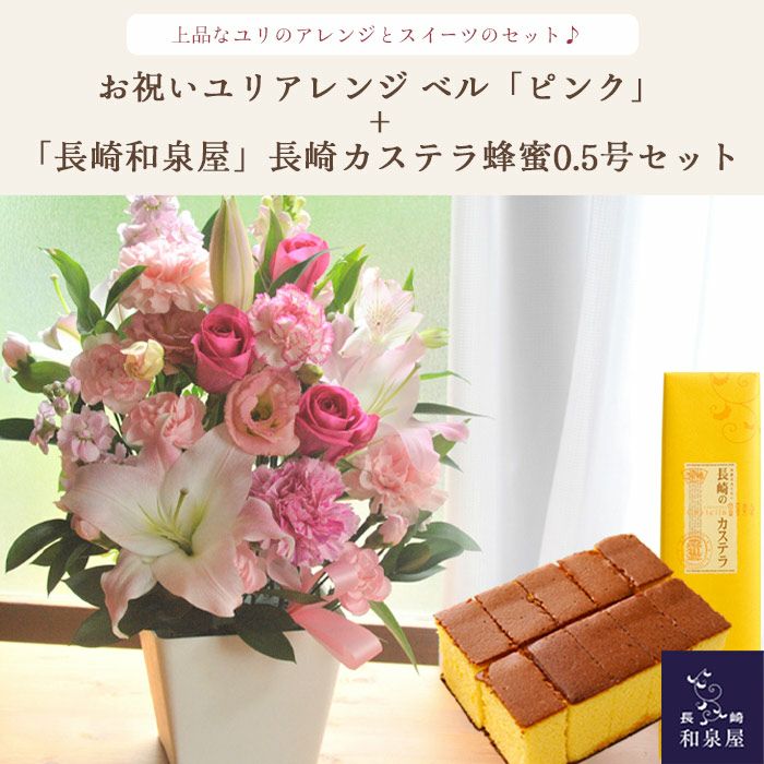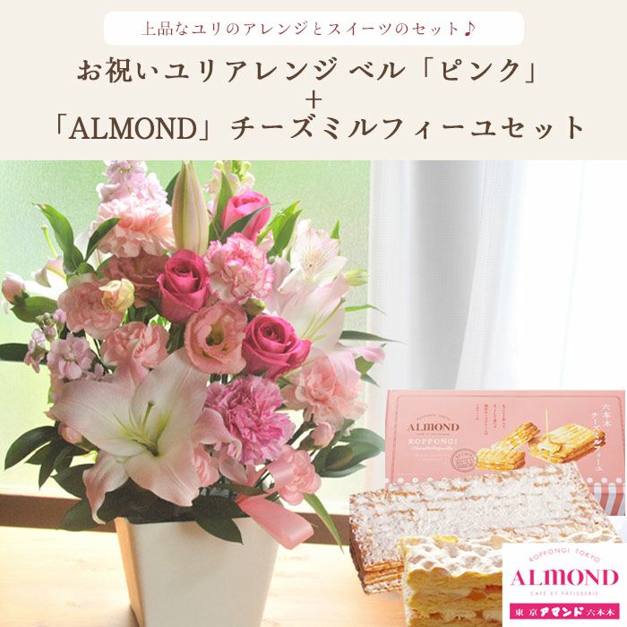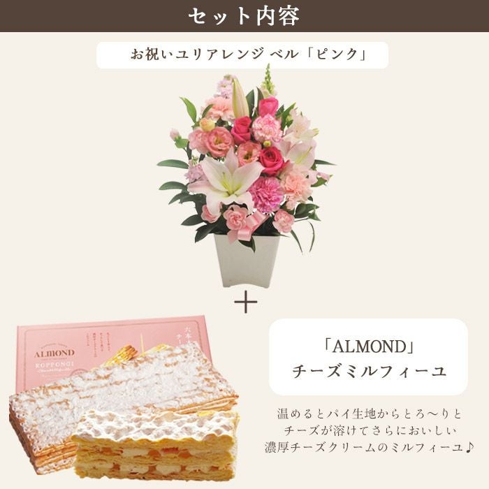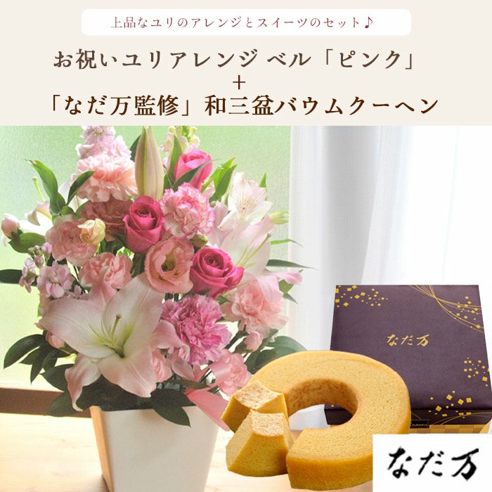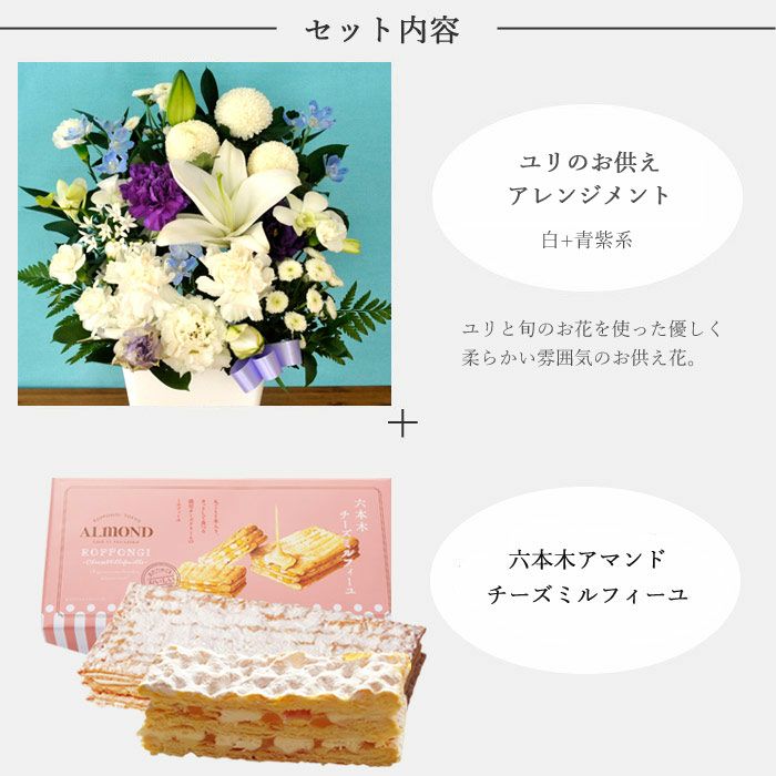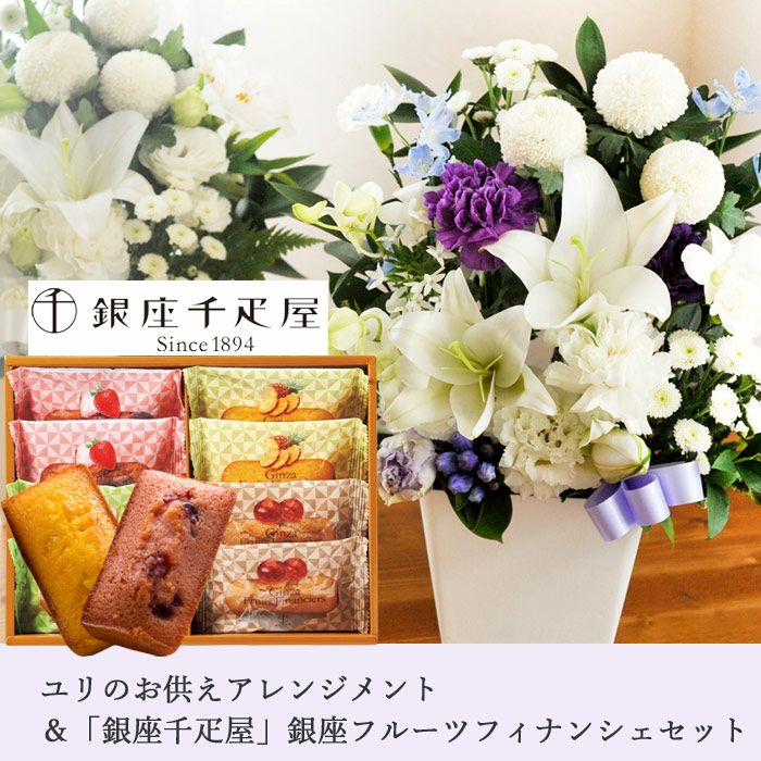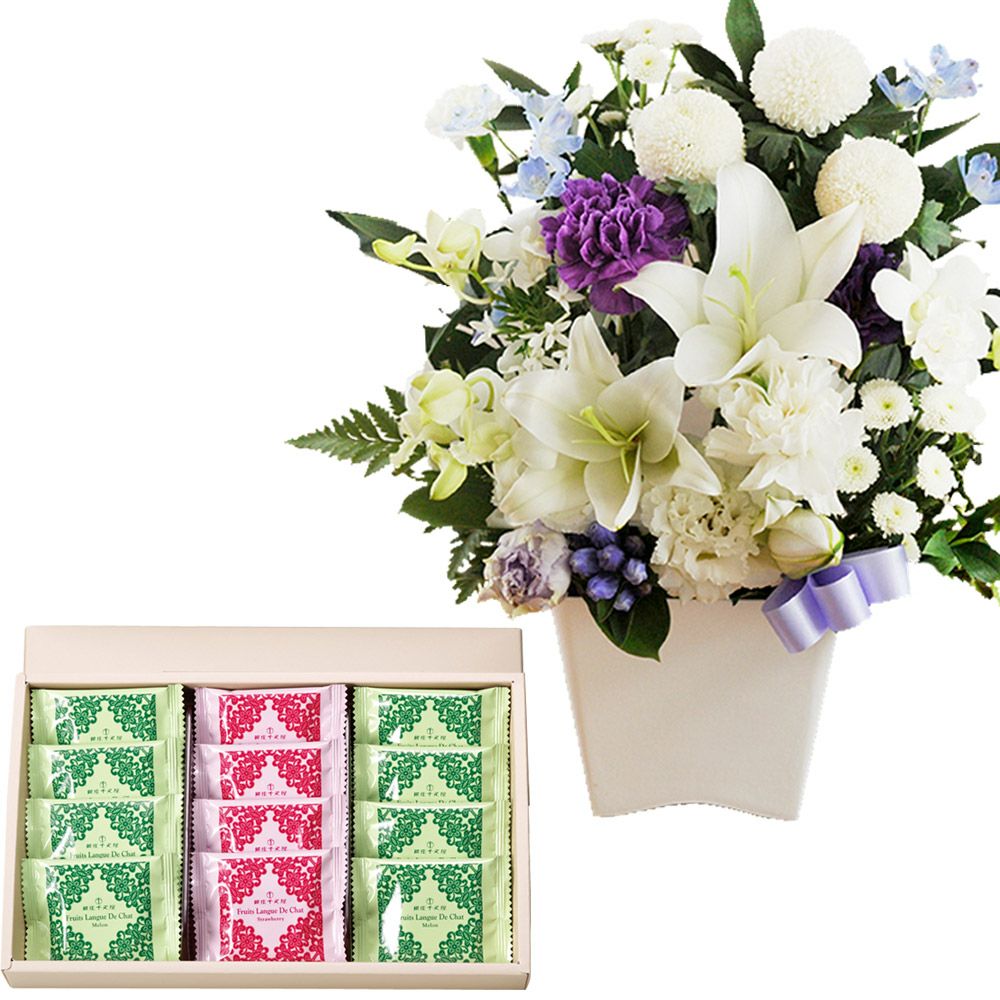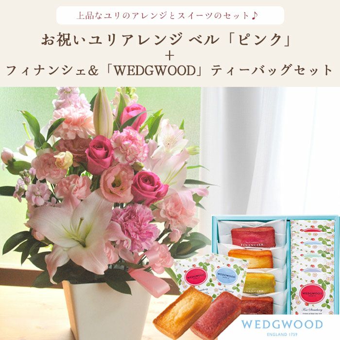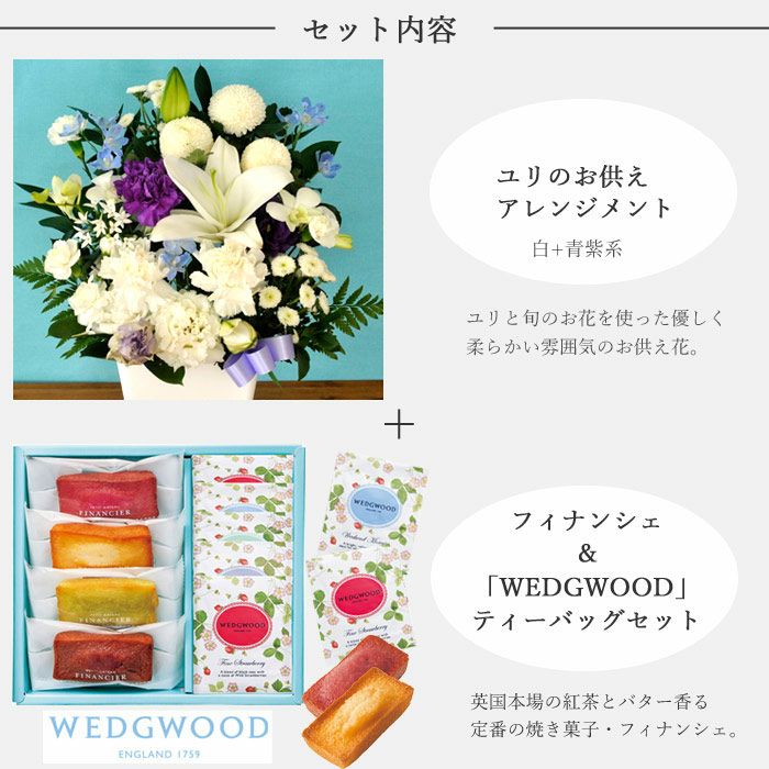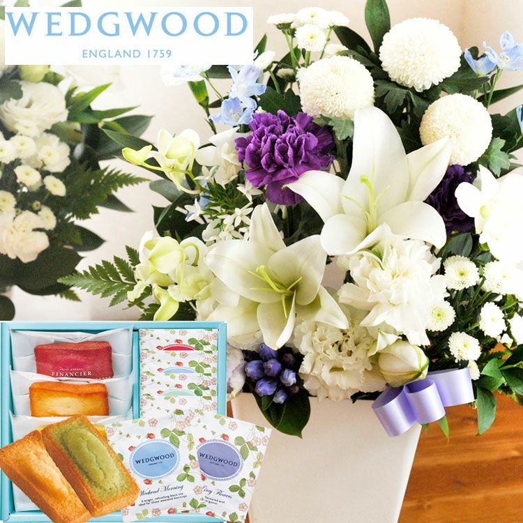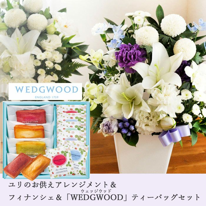 洋花を使った ユリのお供えアレンジMサイズ+フィナンシェ&【ウェッジウッド】ティーバッグセット WEDGWOOD(ウェッジウッド) スイーツ セット 生花 FKAASW